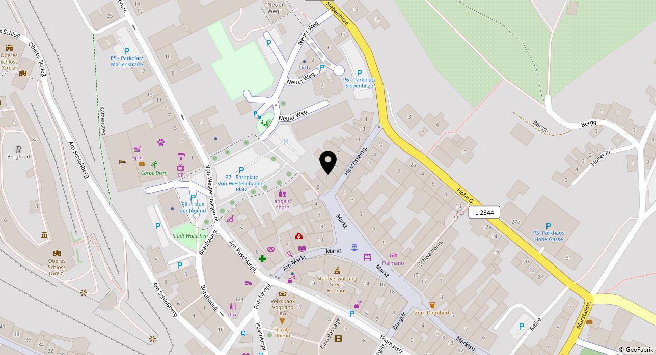Das Objekt liegt im Stadtzentrum der Stadt Greiz am Von-Westernhagen-Platz zwischen Altstadtgalerie und Rathaus. Hiert befindet sich eine Passage, welche den von Westernhagenplatz mit dem Markt inkl. Rathaus verbindet.