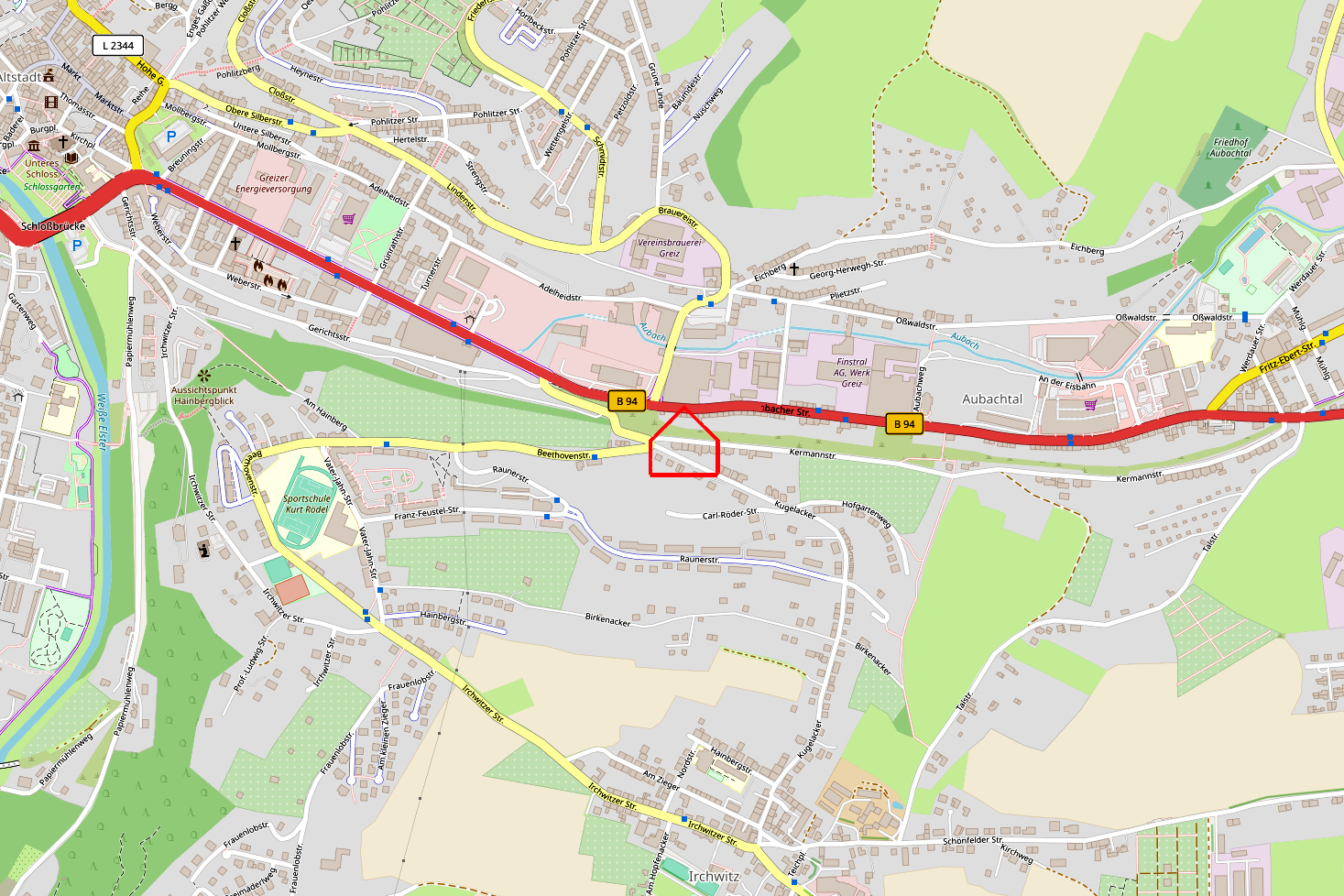 Das Anwesen befindet sich auf halber Strecke vom Zentrum in Richtung Ortsteil Aubachtal. Den Ortskern des Stadtteils mit Einkaufsmöglichkeiten, Eissportbahn, Hallenbad, Freibad erreichen Sie, ebenso wie das Stadtzentrum mit seinen Schlössern, Einkaufsmöglichkeiten, allen Geschäften des täglichen Bedarfs, Schulen, Kindergärten, Banken, Behörden, Ärzten, Gaststätten, Museen, Bus- und Bahnanbindung sowie dem sehenswerten Greizer Park, in ca. 5 Minuten mit dem Fahrzeug und in jeweils etwa 15 bis 20 Minuten zu Fuß.